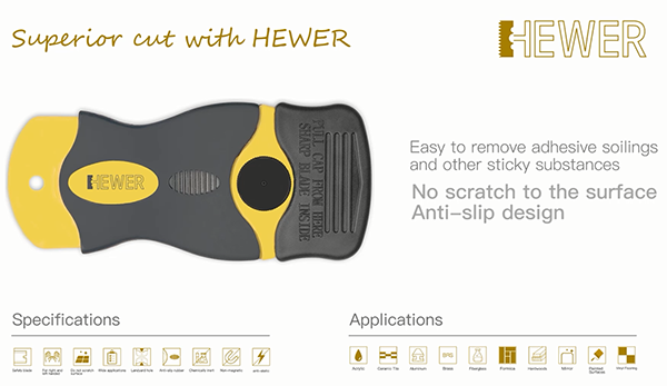 HEWER安全刮刀,既不會刮傷原來的物品,又能輕松去掉黏膠垢以及機(jī)器污垢等污漬;這款刮刀還可以輕松去除貼紙以及不干膠,而且還非常安全,不會刮傷自己,非常適合生活或者工作當(dāng)中使用。