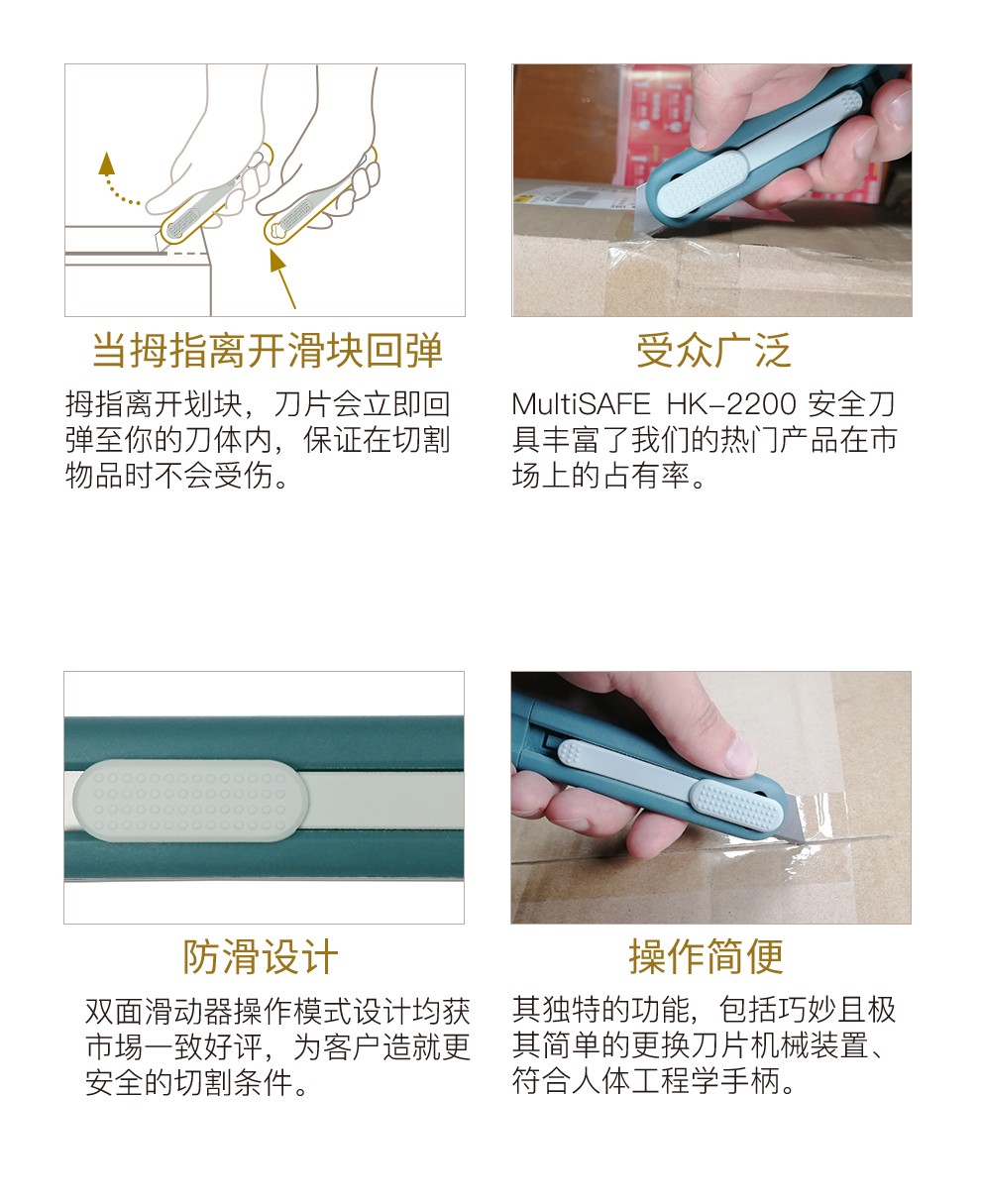HEWER 很高興地宣布推出我們革命性的全新MultiSAFE HK-2200輕巧型安全刀具。這款創(chuàng)新、靈巧的安全刀具豐富了我們廣受歡迎的開箱刀系列,并自豪地專為工廠、辦公室及家庭應(yīng)用而設(shè)計(jì)。獨(dú)特的功能包括設(shè)計(jì)巧妙且極其簡(jiǎn)單的刀片更換系統(tǒng)。其他亮點(diǎn)包括其人體工程學(xué)手柄,其中單側(cè)滑塊設(shè)計(jì)讓左、右撇子亦能靈活使用。。