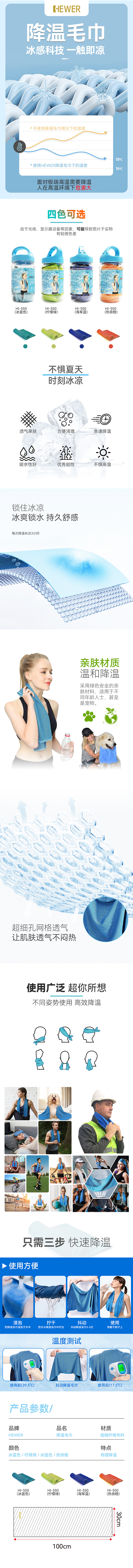 HEWER MultiICY 降溫毛巾通過獨特的降溫技術(shù)利用毛巾中的水分吸走皮膚上的汗水,過程中不使用任何化學品,科學不傷皮膚。適合當作戶外活動毛巾、運動毛巾使用。